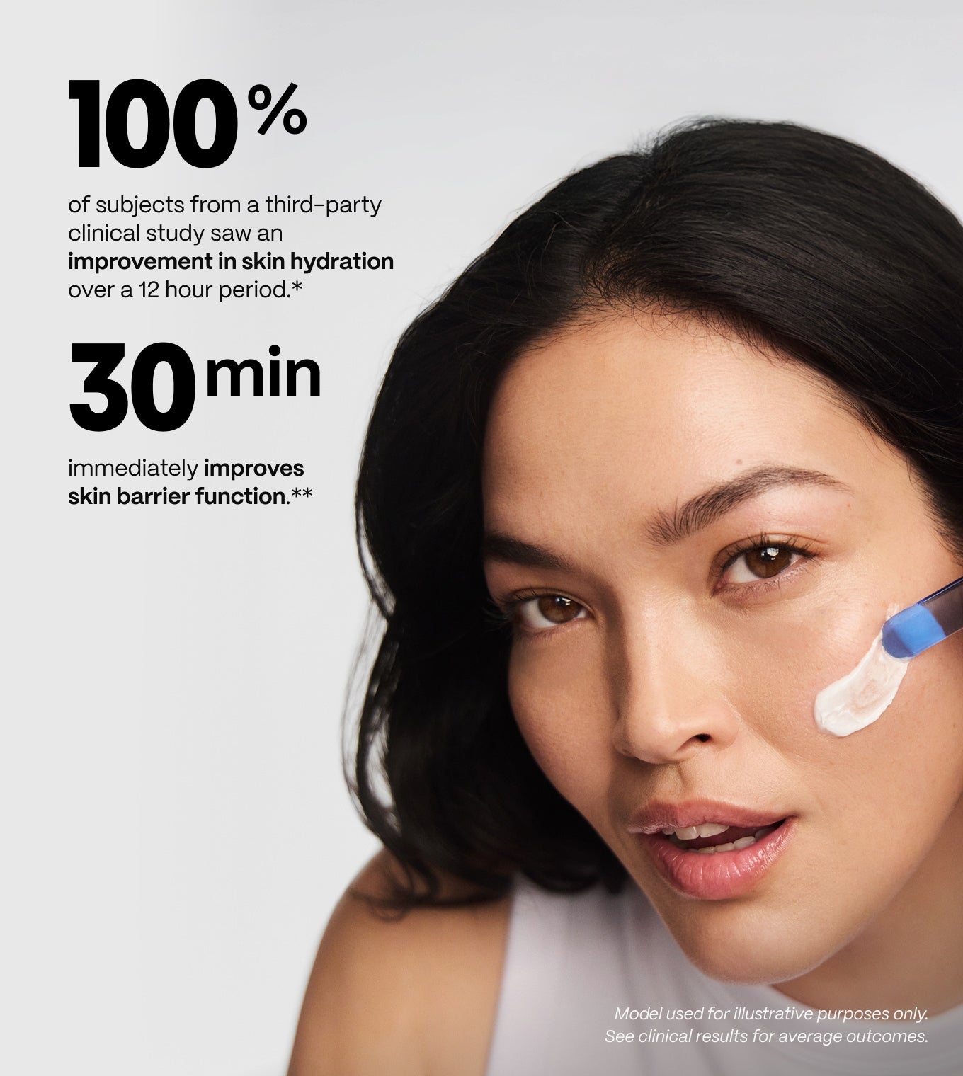 **Provides temporary repair to skin’s moisture barrier function in 30 minutes based on third-party instrumental transepidermal water loss test of 32 subjects.
